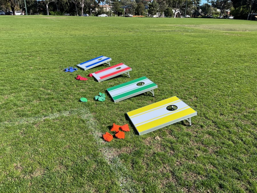 Our custom made corn hole games are a great option for sports days challenges. Suits just about every age group and ability. This set is 4 individual corn hole boards with 4 bean bags per board.