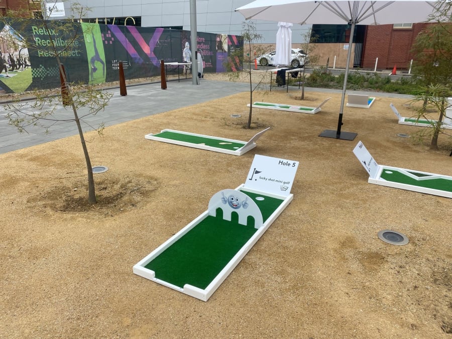 Our new white mini golf course is ready for putters of all ages and abilities. This clean and modern course features a number of fun mini golf challenges like windmill, through walls, bunkers, zig zag ramps and more. This course has branding opportunities throughout and can be themed to your event or business branding.