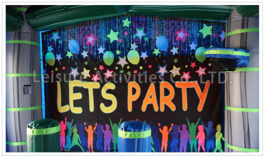 This awesome castle is an absolute beauty. Our new Glow castle features custom neon highlights, led lighting, roll down windows, inflated pop ups, basketball ring and a decent bounce area. The whole castle is made with a unique marble vinyl that presents perfectly in any setting. With the roll down windows and full roof the kids can create a dark environment even outside in the sun! This unit is great for discos, backyard evening parties and fun incursions.