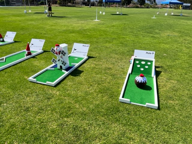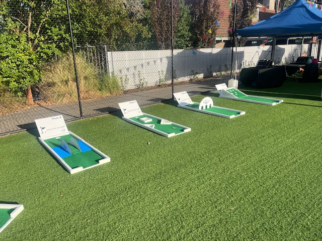 Our new white mini golf course is ready for putters of all ages and abilities. This clean and modern course features a number of fun mini golf challenges like windmill, through walls, bunkers, zig zag ramps and more. This course has branding opportunities throughout and can be themed to your event or business branding.