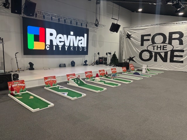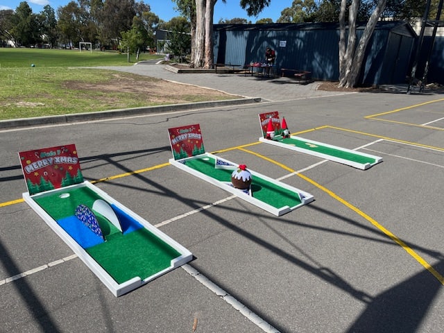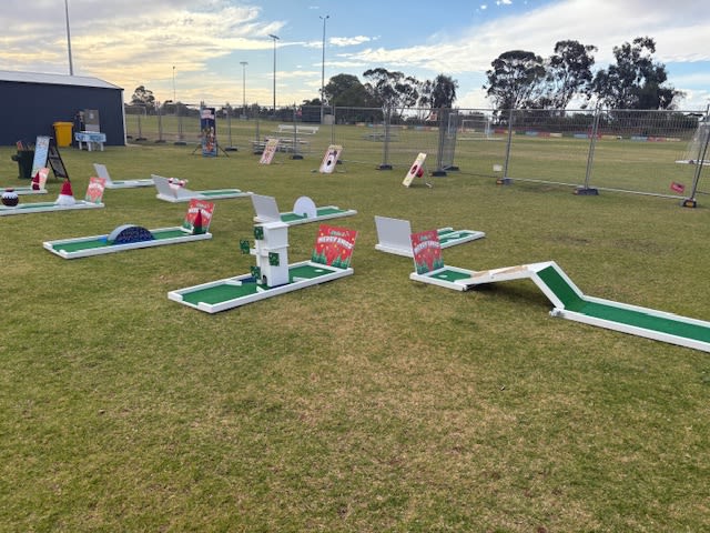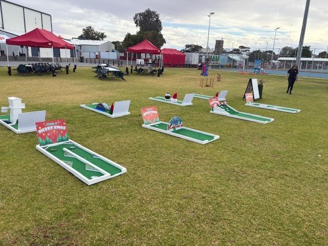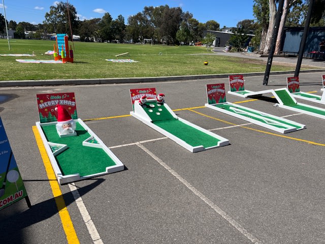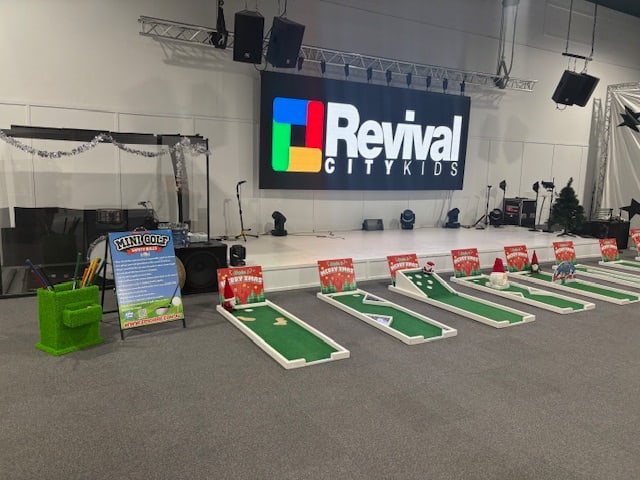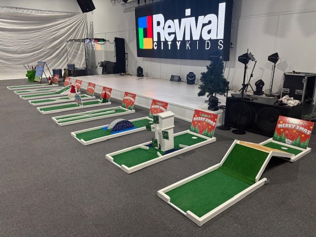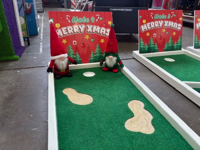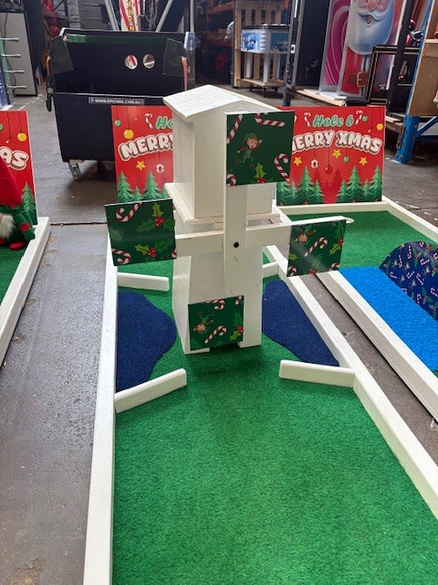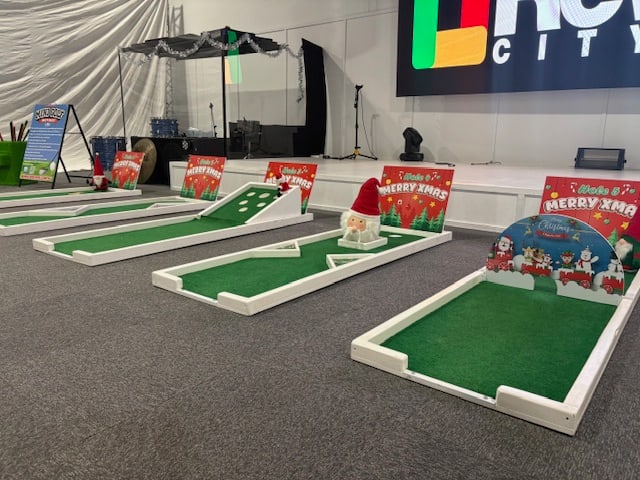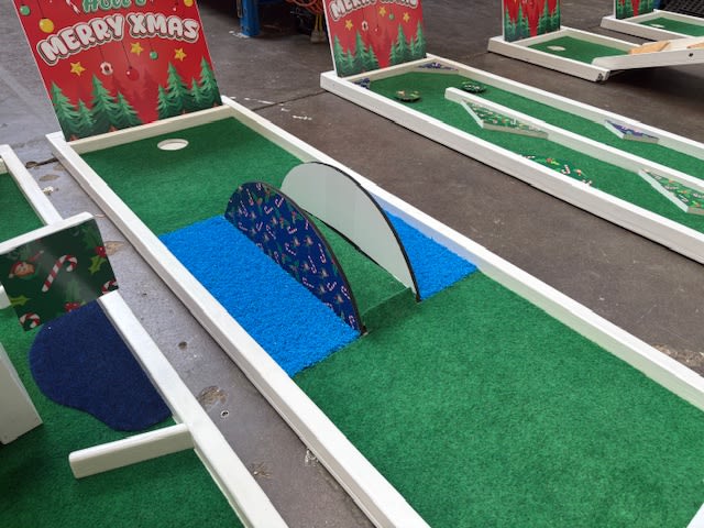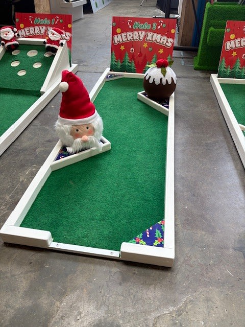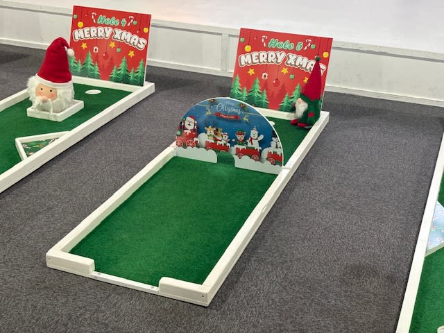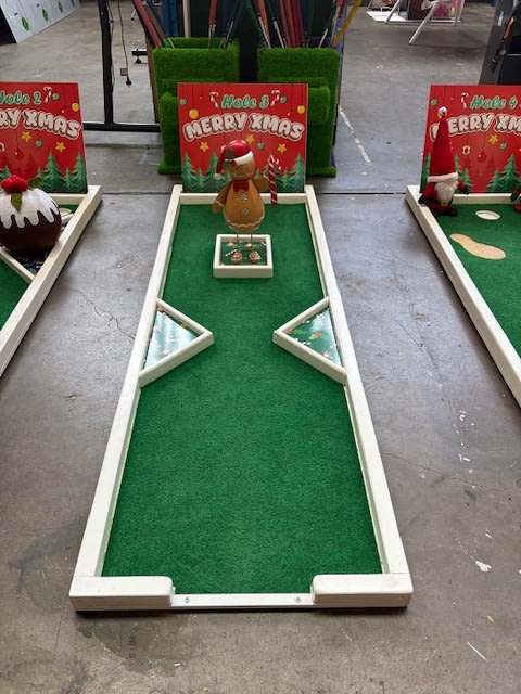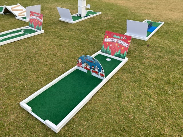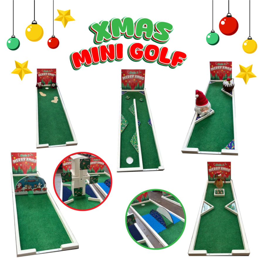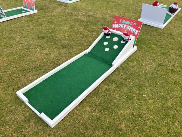 Our new Xmas mini golf course is ready for putters of all ages and abilities. This clean and modern course features a number of fun mini golf challenges like windmill, through walls, bunkers, zig zag ramps and more but with a festive twist. This course has branding opportunities throughout and can be themed to your event or business branding.