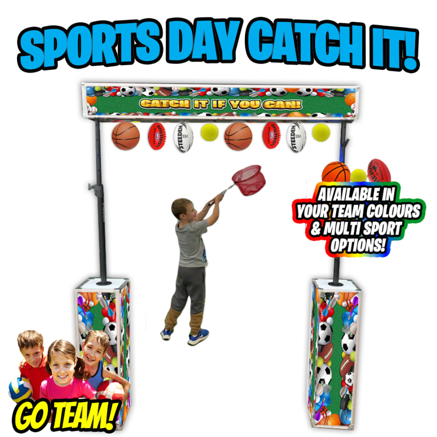 Our Sports Day catch it game is a truly unique and fun addition to any sports day or sports incursion. This set features bright digital graphics, sound effects and multiple sports balls as the catch props.