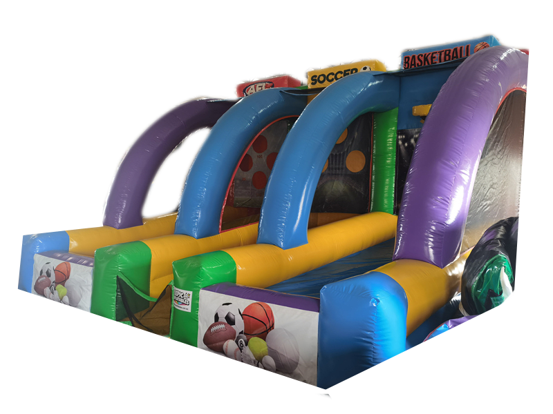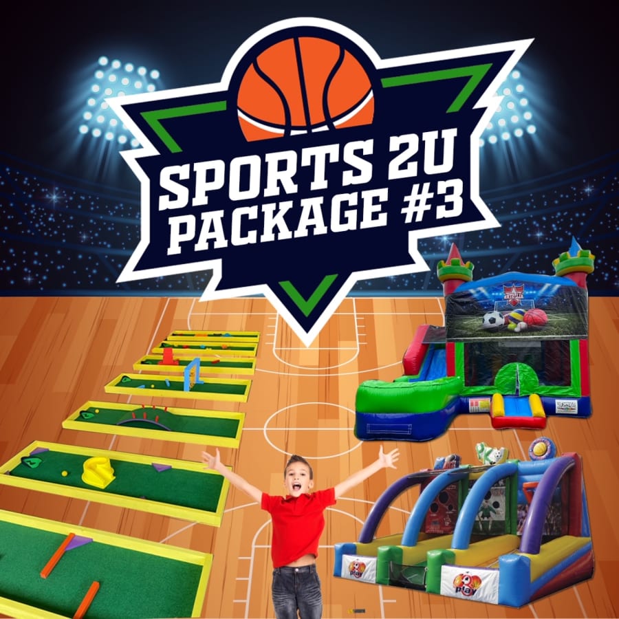 This Sports package is a great option to keep a wide age group of kids entertained all day long. Featuring a colourful Sports combo bouncy castle, 3 Play sports & 9 holes of action packed mini golf its got something for everyone.