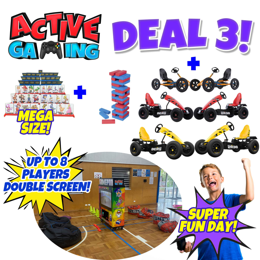 This one is sure to keep the kids busy all day long with smiles from ear to ear. Who wouldnt want to go from racing mario on the screen to racing in real life! This package combines some great amusements to suit a wide age group and about 20 kids at a time. It includes: