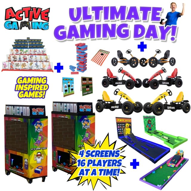 This Ultimate gaming fun day package combines the best of both worlds with a huge amount of fun on and off the screen. Lots of custom made games to get the kids to try out their gaming skills in real life! This whopper of a package is great for up to 30 kids at once with the huge amount of multiplayer activities. It includes: