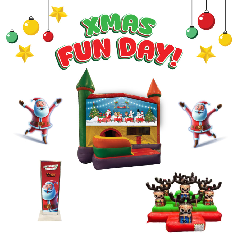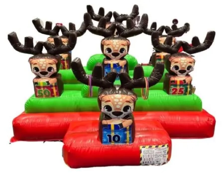 Introducing our latest Xmas Package which includes Xmas C5 Combo, Reindeer Toss and Santa or Snowman 10 second challenge. Our C5 Combo features a bounce area, basketball ring, and crawl tunnel, and our Reindeer Toss inflatable is a mega version of the classic ring toss game using hula hoops.